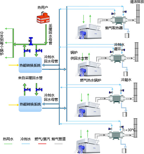 該項目采用雙良清潔能源集成系統(tǒng),在分析總結(jié)煙氣中水蒸汽冷凝率與排煙溫度的關(guān)系、冷凝率與熱效率的關(guān)系等研究結(jié)果的基礎(chǔ)上,采用雙良核心燃燒技術(shù)及超級冷凝技術(shù),將鍋爐排煙溫度降至30℃以下,充分吸收利用煙氣中的顯熱和水蒸汽凝結(jié)過程中釋放的汽化潛熱,大幅提高燃氣利用率,降低供熱系統(tǒng)能耗,熱效率可達108%。